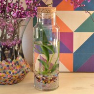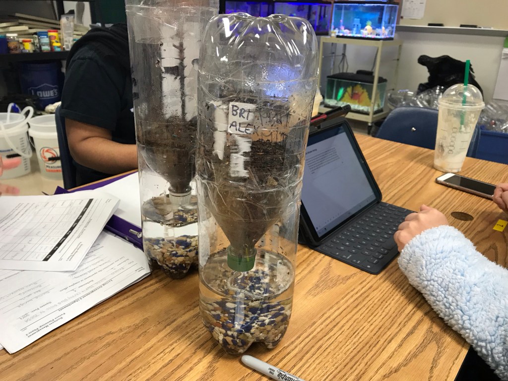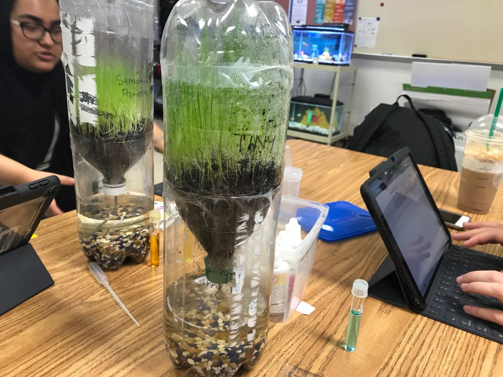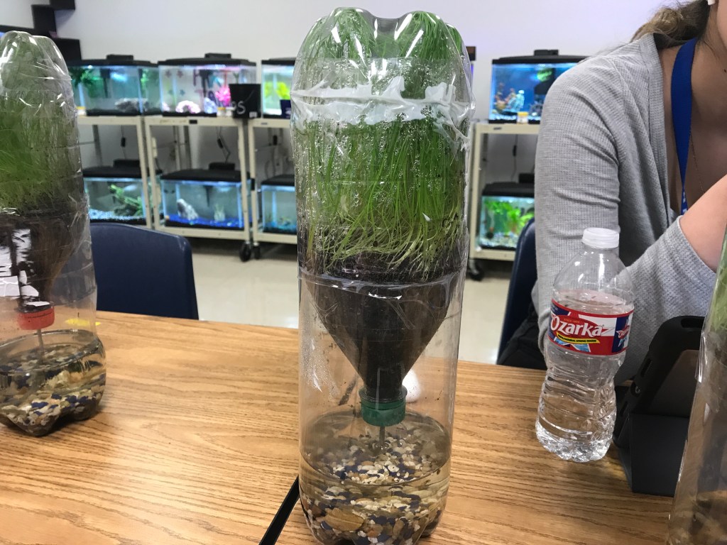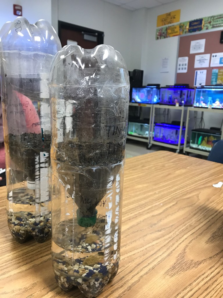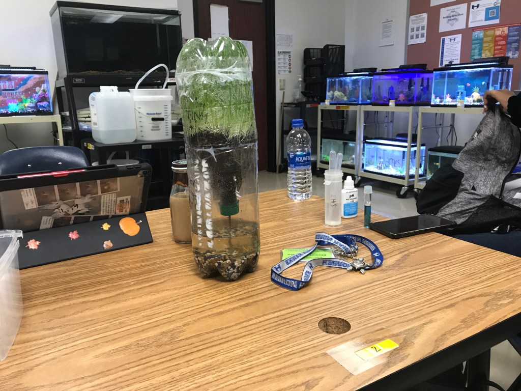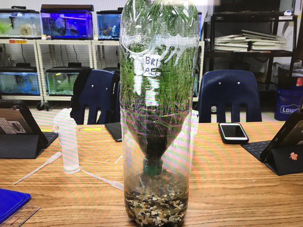 Tiny Tim’s water level hasn’t changed and is still at 6.5 centimeters. He still doesn’t have algae but he has plant growth. The grass has grown more than the bottle will allow height wise. There is condensation on the top and bottom of the bottle biome which indicates cooling temperatures. His grass is still growing and bending sideways still. His water is changing into a more ivory color and also there will not be enough room for any further plant growth due to how small the bottle is in general.